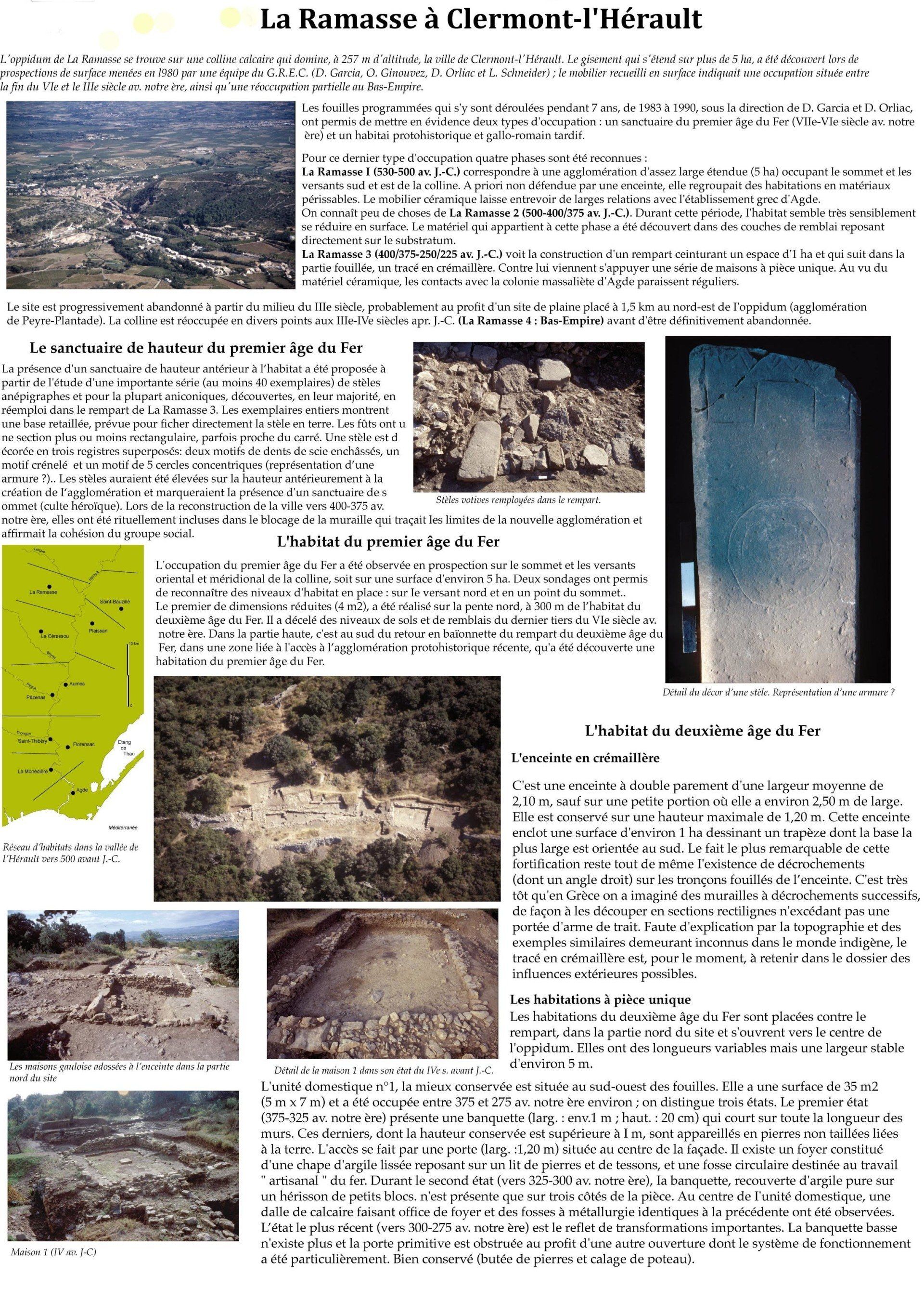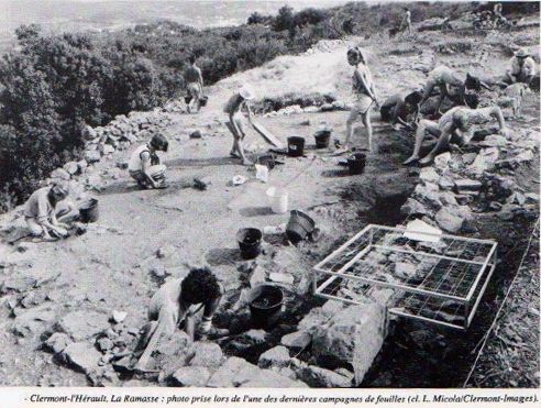 Durant les années 1983 à 1990, des archéologues, Dominique Garcia, Didier Orliac, Laurent Schneider et Olivier Ginouvez, issus du club archéologique G.R.E.C. créé en 1973 par Jacques Belot, ont entrepris des fouilles sur la colline de la Ramasse au-dessus de la ville de Clermont l'Hérault. Celles-ci ont permis de mettre en évidence des habitations construites pour partie basse en pierres sèches et la partie supérieure en matériaux périssables. Les quatre "jeunes" archéologues fin 1980.